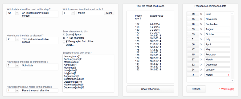 The database allows you not only to make corrections to (that is, added to) individual cells in the import tables, it also gives you the possibility to change the formatting or regular mistakes in the data. For example, a column may contain dates in different formats, or someone often miss-spells a particular name. Advanced programming of specific transformations is also possible. With a simple test facility you can quickly see the result of the changed formatting and manual corrections.
