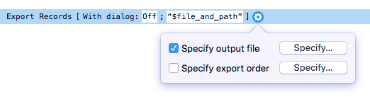 My biggest problem with the ‘export records’ script step is that field selection can only be done at programming time, not at deployment time. Unless one invests a lot of development effort ( I will get back to this later ) the user can only be given a lot of flexibility by setting the ‘With dialog’ option to ‘on’.