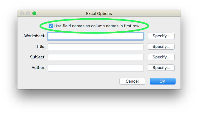 • Make sure you select the File Type ‘Excel Workbooks (.xlsx)’. After you do so, you will end up in the ‘Excel Options’ dialogue where you uncheck the ‘Use field names’ option.