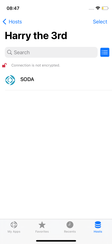 The image to the right shows the dialogue screen to open a file on the host. If sharing is on and the wifi network operational, the FileMaker Go will find the available hosts, and one can select the one needed. In the image, my laptop is Harry the 3rd, and the SODA database is visible. Tabbing it will open it.