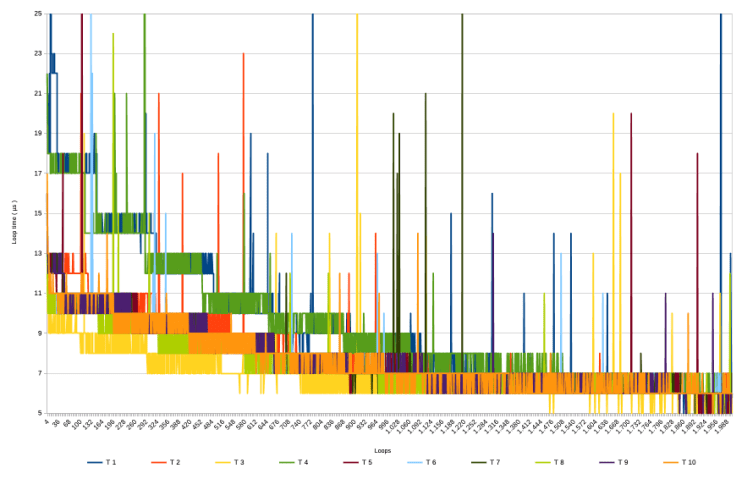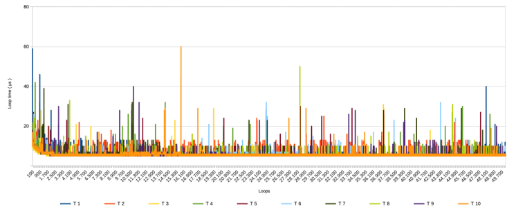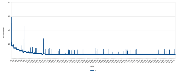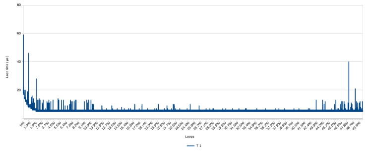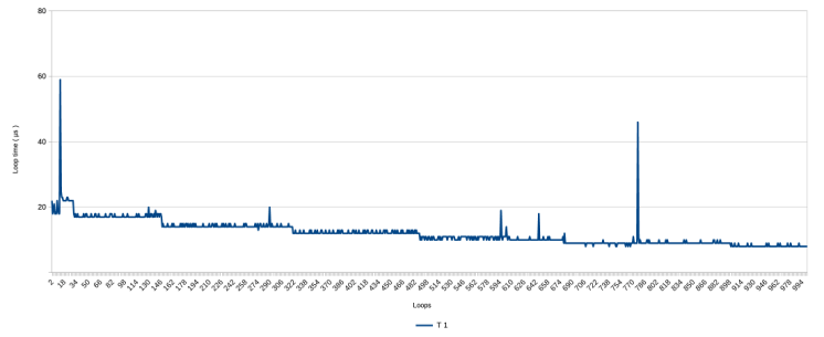 - All test runs show spikes, but the patterns vary between them. It seems that the distribution of the higher spikes in T 1 ( with most in the first and last 10.000 loops ) was a coincidence.