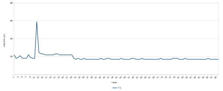 - At the beginning, there is a first steep and than gradual decline in the measurements ( ie a speed improvement ) down from about 20 µs.