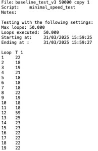 For no other reason than time limitation, the minimal_speed_test was run 10 times following the method described in the previous chapter. Each run involved 50.000 loops and lasted about 2 seconds. The number of 50.000 was chosen somewhat arbitrary, but at least higher than 2000 based on provisional tests not reported here. Tests with higher loop counts will be presented in this blog at a later date. In line with the cautious approach set out in this post, first the result of just the first test run will be inspected in detail, before adding the results of the subsequent tests.