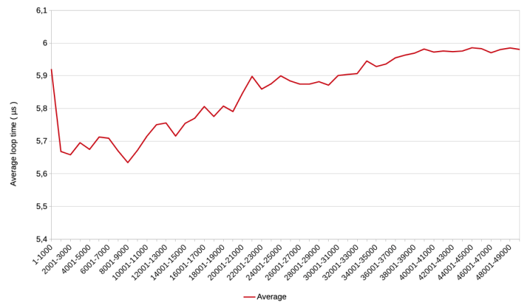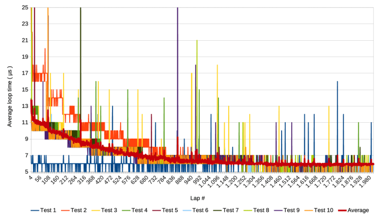 Each point in the above graph shows the average of 10.000 measurements from test run 1 to 10. During the first 2000 laps ( 200.000 loops ), the average loop time drops from 5,9 µs to around 5,65 and remains there for another 700.000 loops. It then gradually increases and stabilizes just below 6 µs.