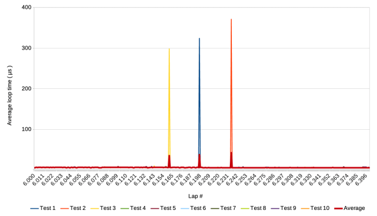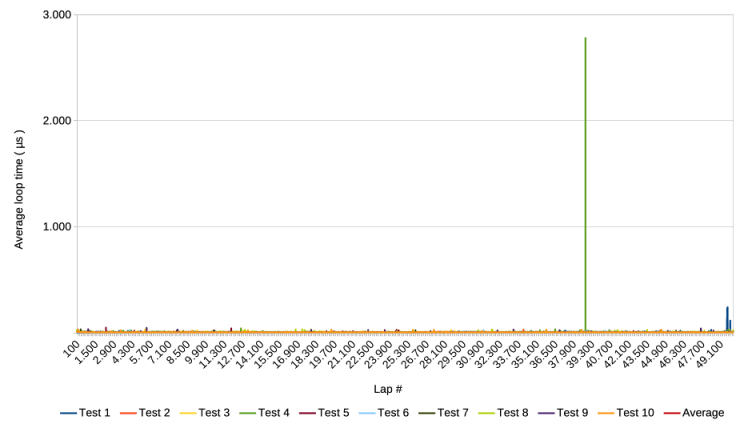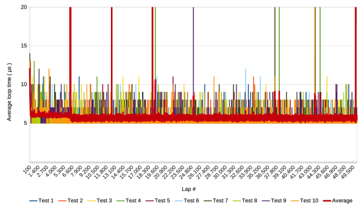 Notice that the y-axis mentions the average loop time. Since a lap in this test has only one loop, it boils down to the actual loop time. Notice that an average is mentioned in the legend but it and other measurements are hidden behind the line for test run 10. Lastly, notice the relatively high spike of 3.000 µs, which is still only 3 ms.