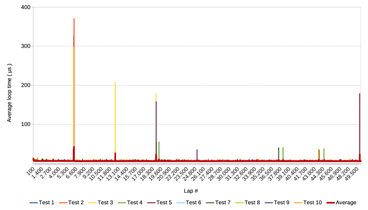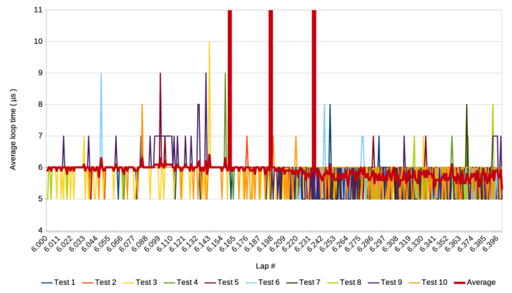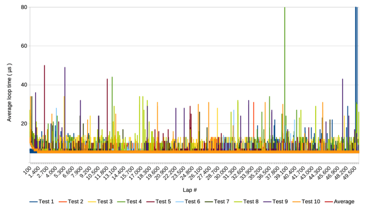 The following graph shows the results of 10 test runs and the average of the 10, when running 5e4 laps of 10 loops.