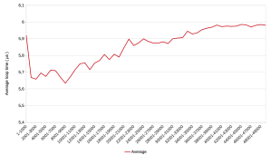 In the graph above, a decrease in speed, i.e. an increase of the average over the 10 test runs, becomes visible from around 13.100 laps or 1,31 M loops. Further zooming in on the y-axis and reducing detail through averaging, delivers the following graph.