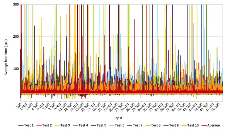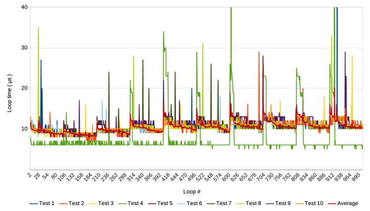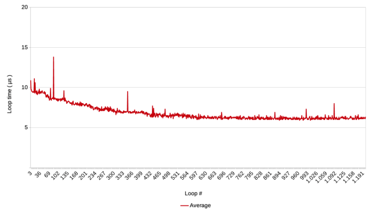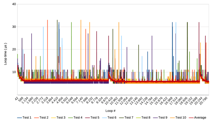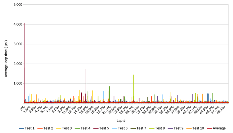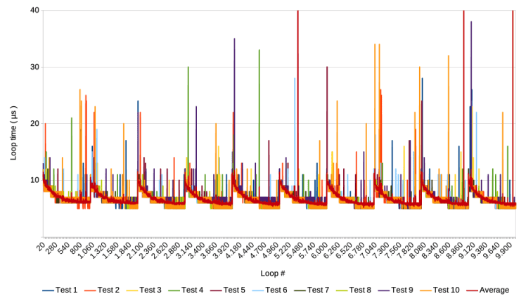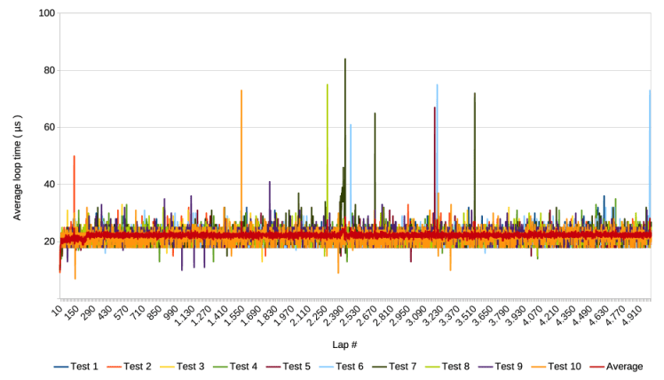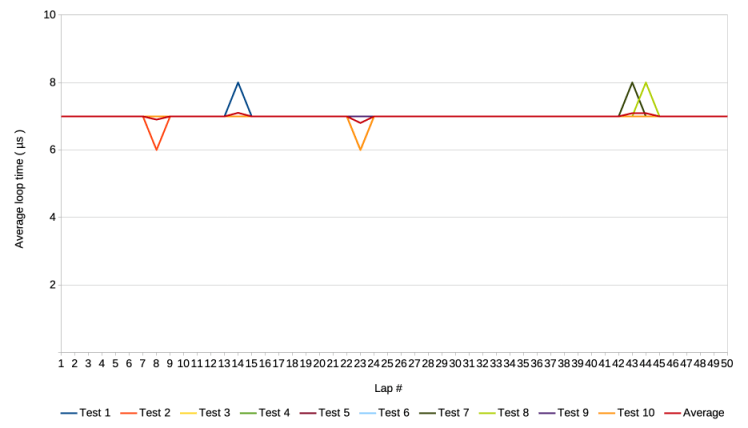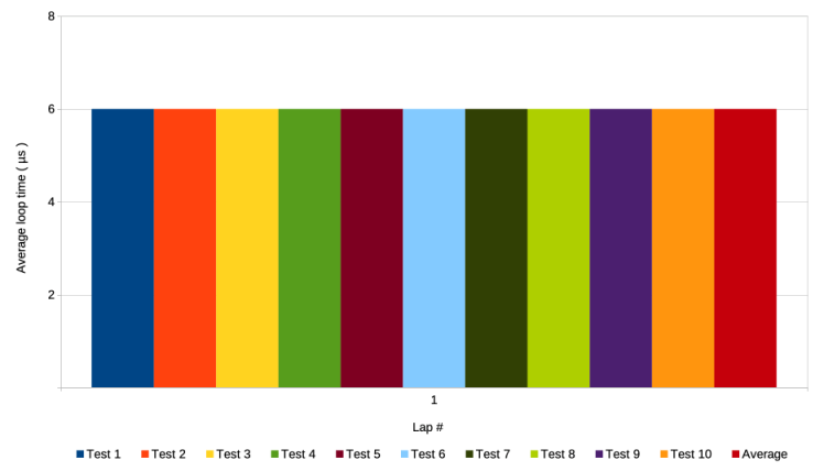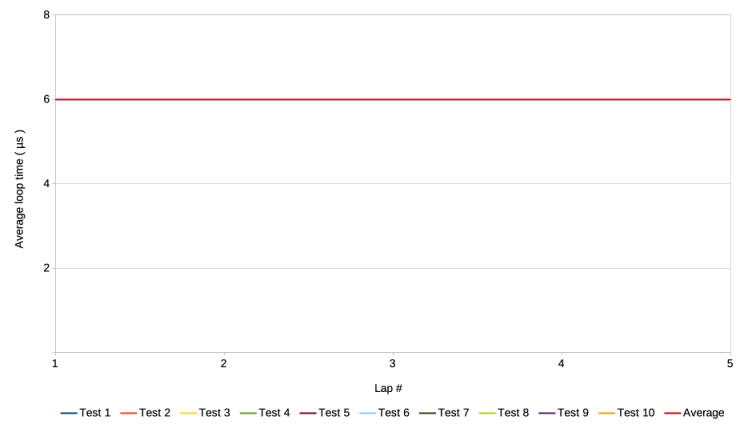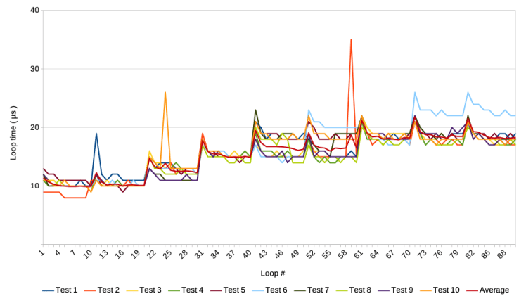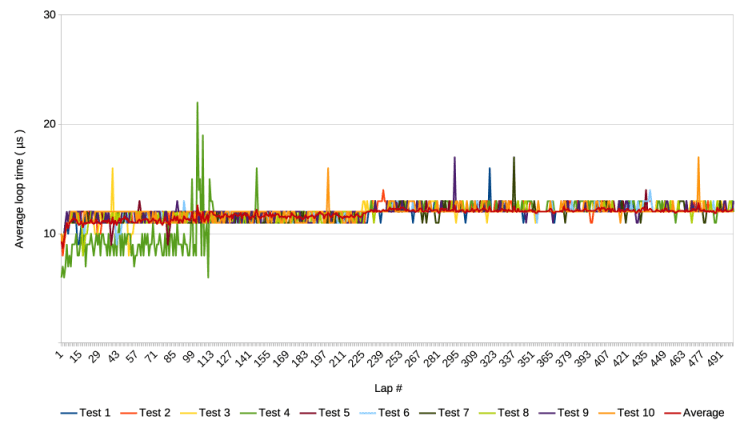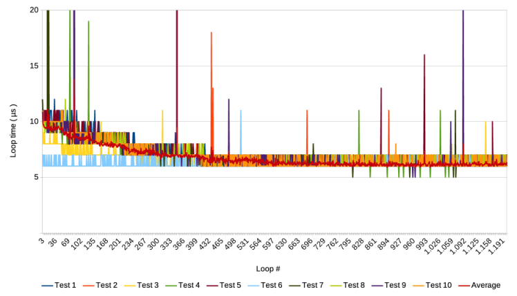 Row A provides the overviews of all laps, all test runs and the average. The most important thing to observe is that from test 1 to 5 to volatility of the graphs diminishes, and the average loop time drops from around 20 µs to a steady 6 µs.