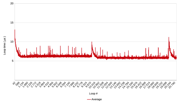 More in detail: just as v2, v3 does not measure individual loop times, but calculates the average loop time at the end of a ‘lap’ of several loops. Both the number of loops and the number of laps / the lap size can be set. v3 updates the progress indicator after each lap. To see if v3 could reproduce the results of v1 with 50.000 loops, v3 was run with 50.000 loops and a lap size of 1 loop. I call this a calibration test. The average loop time of v3’s calibration test is around 43 µs, whereas v1 and v2 resulted in around 6 µs. Also, the pattern that is visible in the results of v1 and v2 was not reproduced in v3.