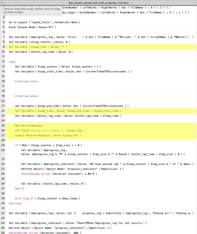 Baseline script v4 was named laps_based_speed_test_with_progress_indicator and programmed as follows. The highlighted areas show the essential difference with the script that was used as v3.