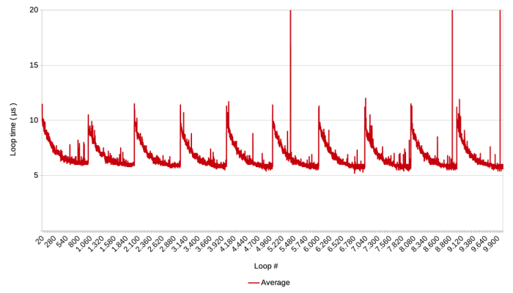 I found out that ( on a Mac M1 with MacOS Ventura and Sonoma ) FM runs into a ‘speed bump’ ( for my lack of a better word ), when it executes a Pause step. Obviously, the step itself is meant to cause a delay. However, subsequent steps actually take longer to execute then they did before the pause. After some time, the effect subsides and things run as fast as they did before the Pause step. Put into a graph, it looks like this. It depicts what happens when a Pause step is executed every 1000 loops. Note that the graph does not show the duration of Pause step itself.