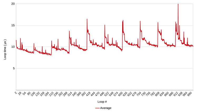 For each script step that I had identified as a potential speed bump, I ran three preliminary test runs of 50.000 loops divided into 25 laps and plotted the results in a graph. If none of the three runs showed the pattern described above, it was deemed to not be a speed bump. Those that did show the pattern were then tested ten times, and their graphs and files saved for reference.