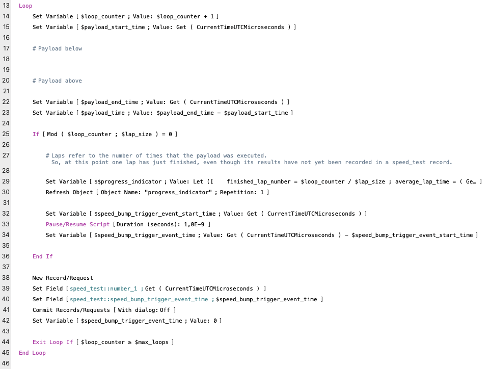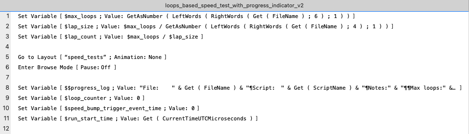 Besides the two number fields that are referenced in the script, the speed_test table also contains the unstored calculation field loop_time, which calculates the loop time as follows: