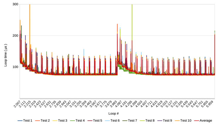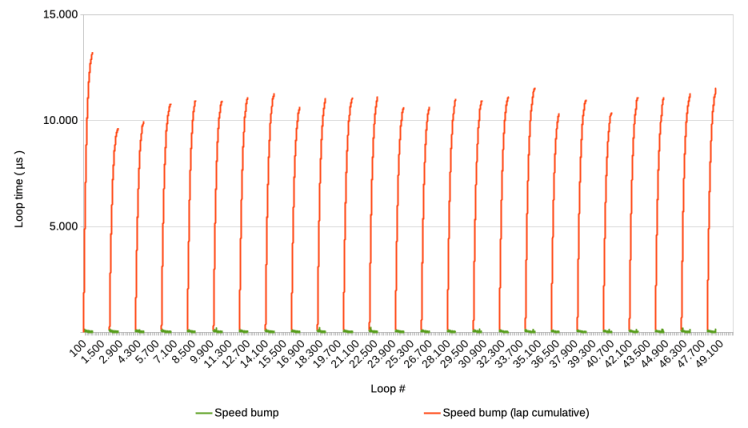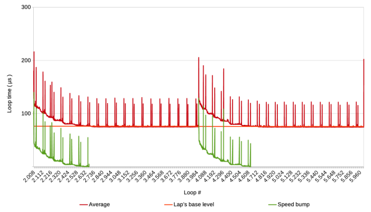 On the other hand, what would happen if the next speed bump is triggered before the previous one died out? During previous tests, we have encountered this a few times. For example, here is a graph showing the average of ten test runs in which a Pause step was executed every 10 loops instead of every 2000.