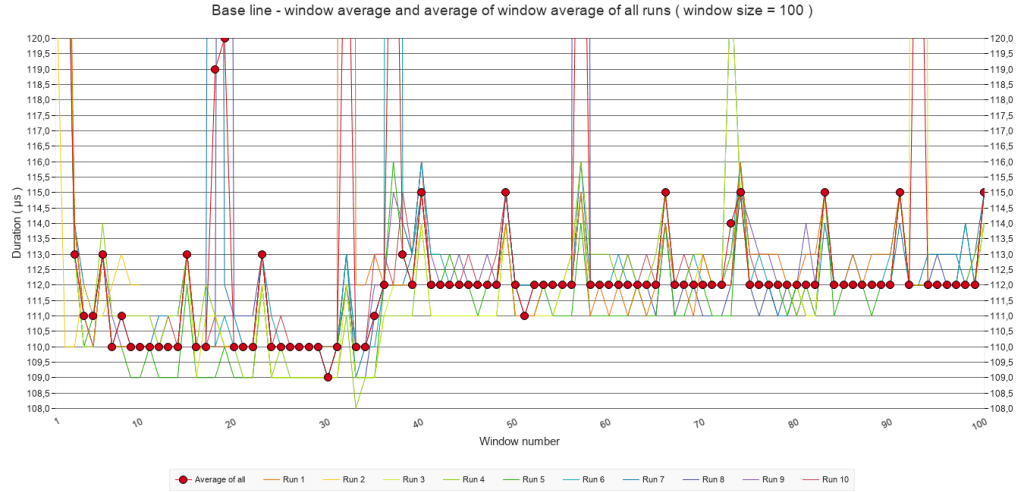 Below is a series of graphs presenting the average of window averages with a window size of 100 for all test runs for each of the five tests. This may sound cryptic. Here is an explanation. A window average is an average over n values. For a test run of 10000 calls, this would mean a series of 100 values. These series were calculated for all test runs of each test, and then the average of these test runs presented in a graph.