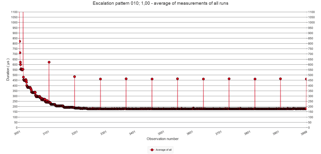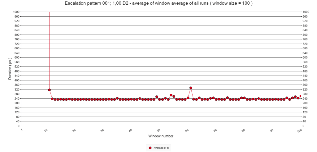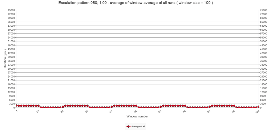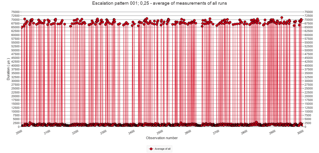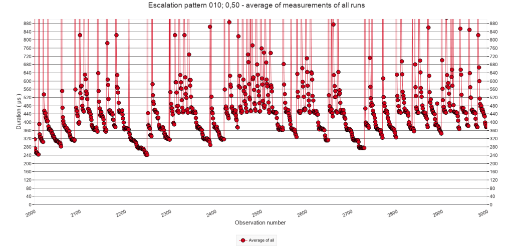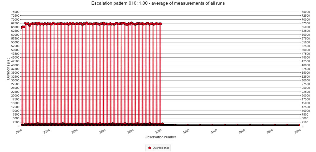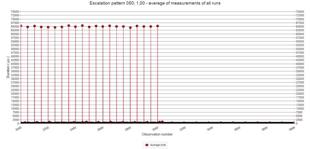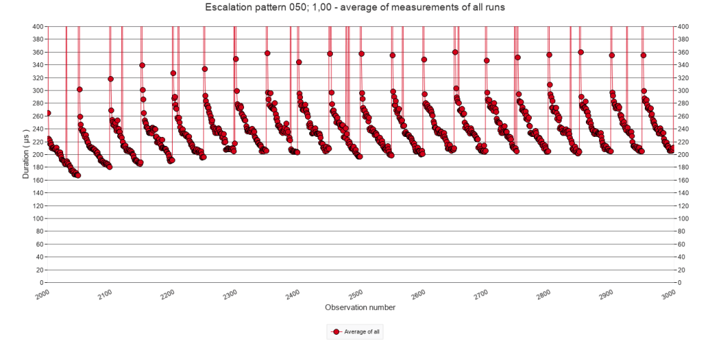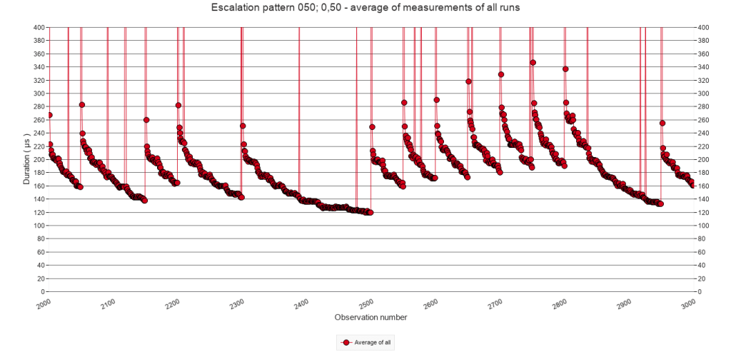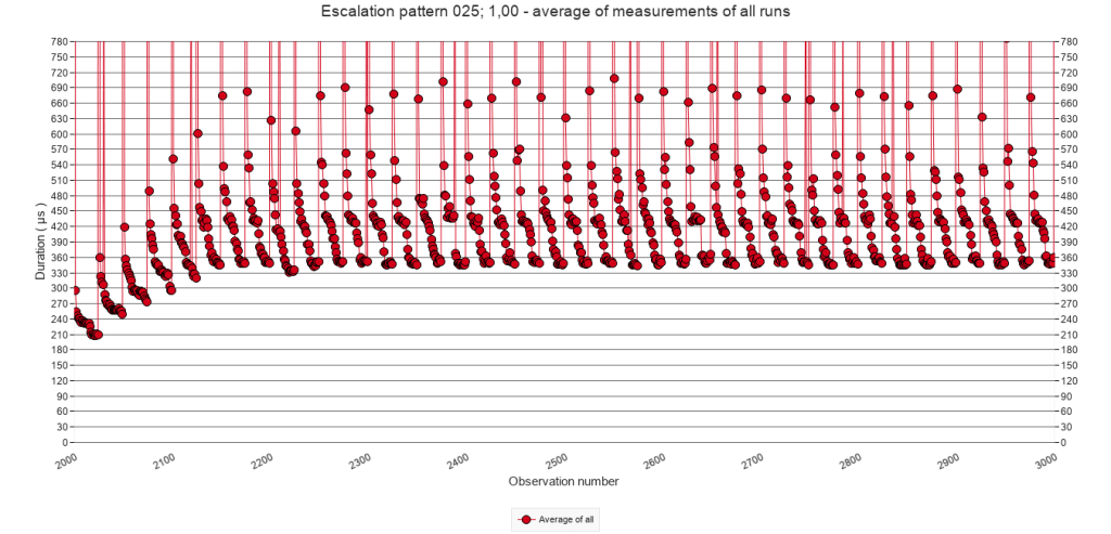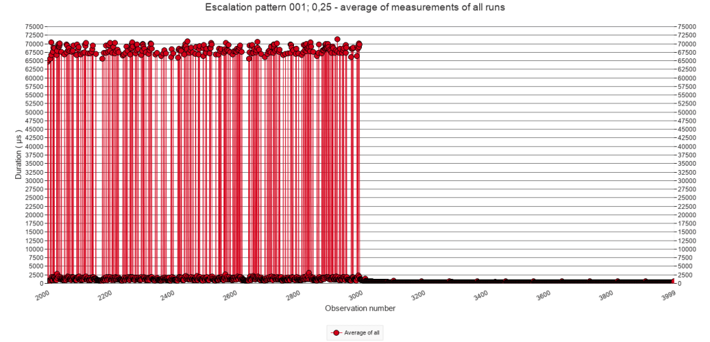 Again, it did not, but more strikingly, during the quiet period script execution time dropped to around 250 µs, rather than µs 750. This is really puzzling to me because the interruption pattern is exactly the same as in D1. Why would it drop to 250 µs instead of 750? The two tests were executed almost a month after the other tests reported here, but their test runs were alternately done during the same hours. If you have a suggestion, please do contact me, or leave a comment. If you want to explore the results, they are included in the download as test ‘Escalation pattern 001; 1,00 D2’.
