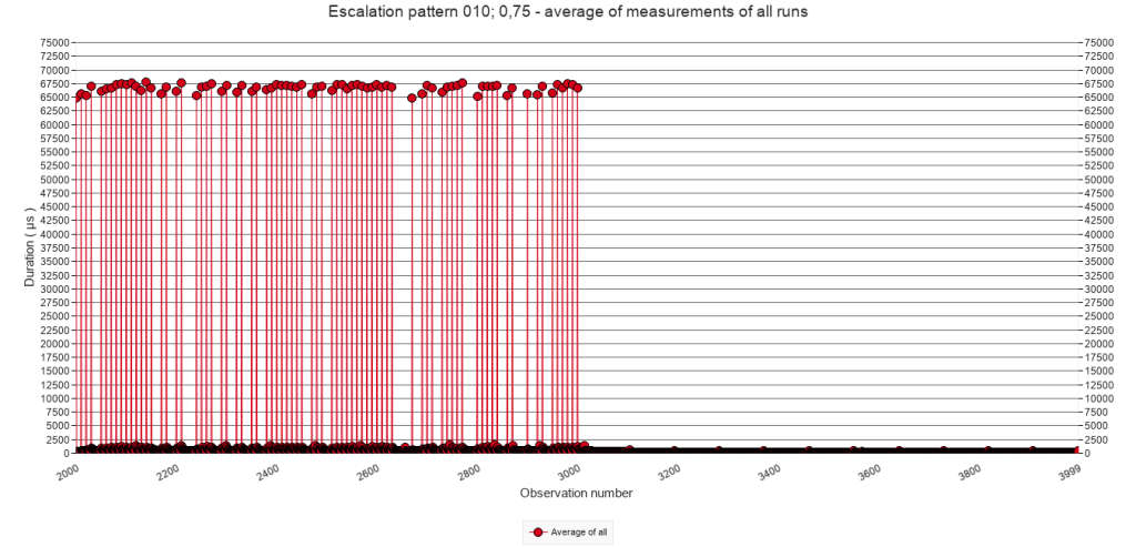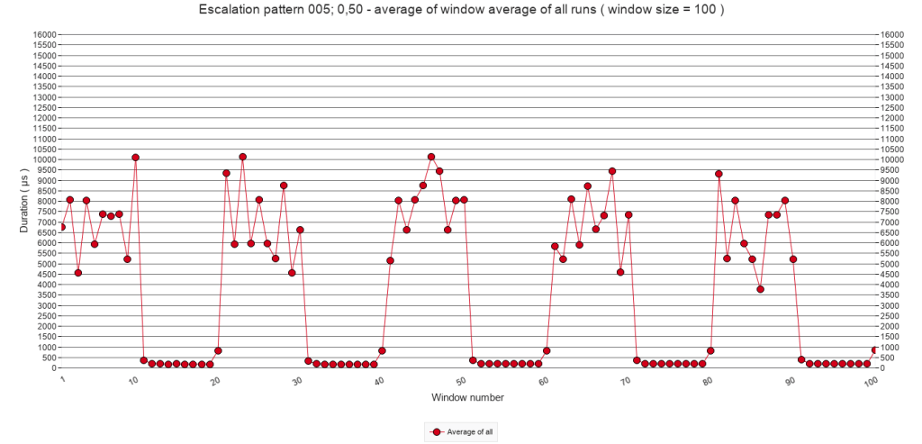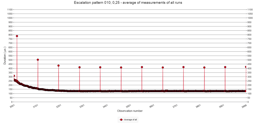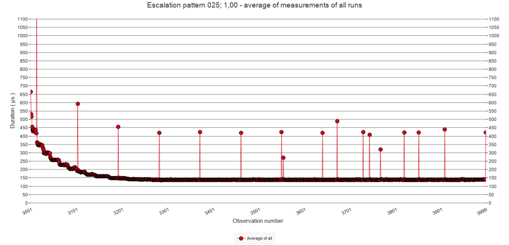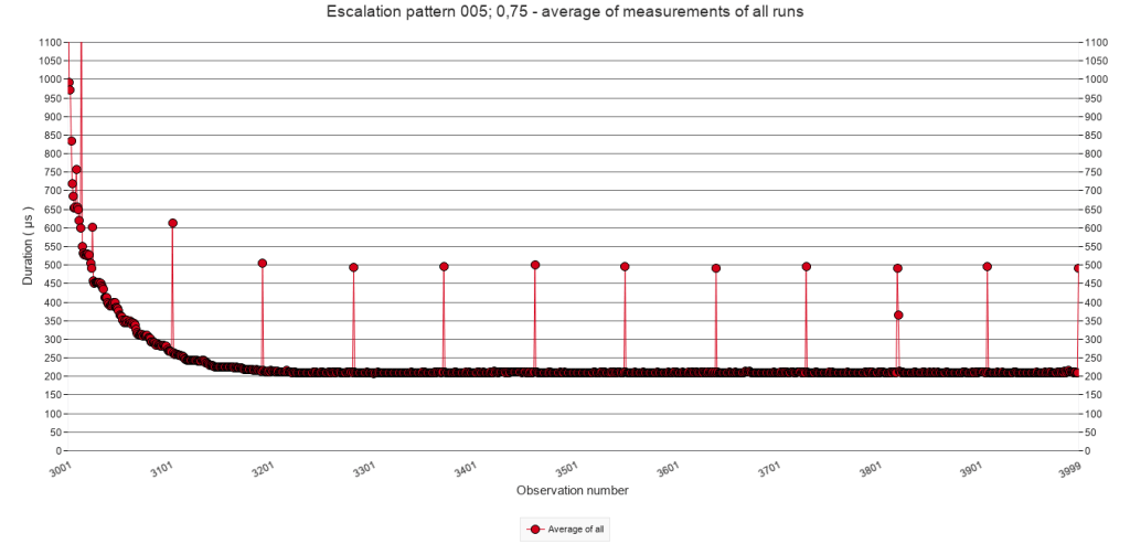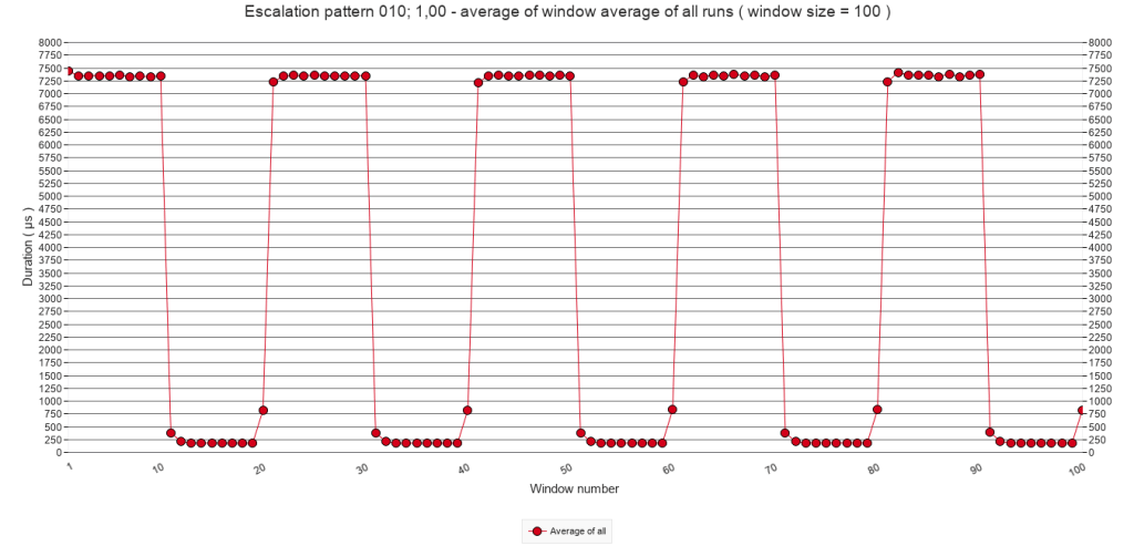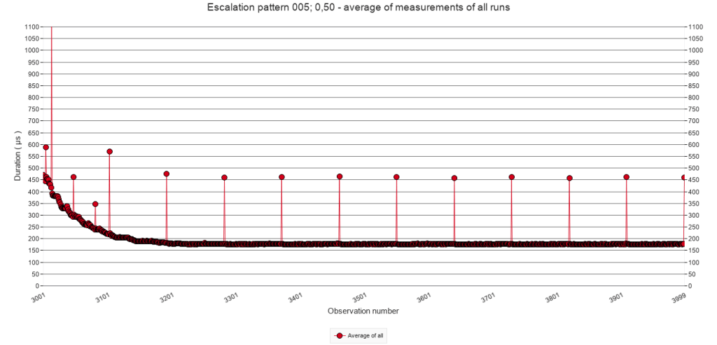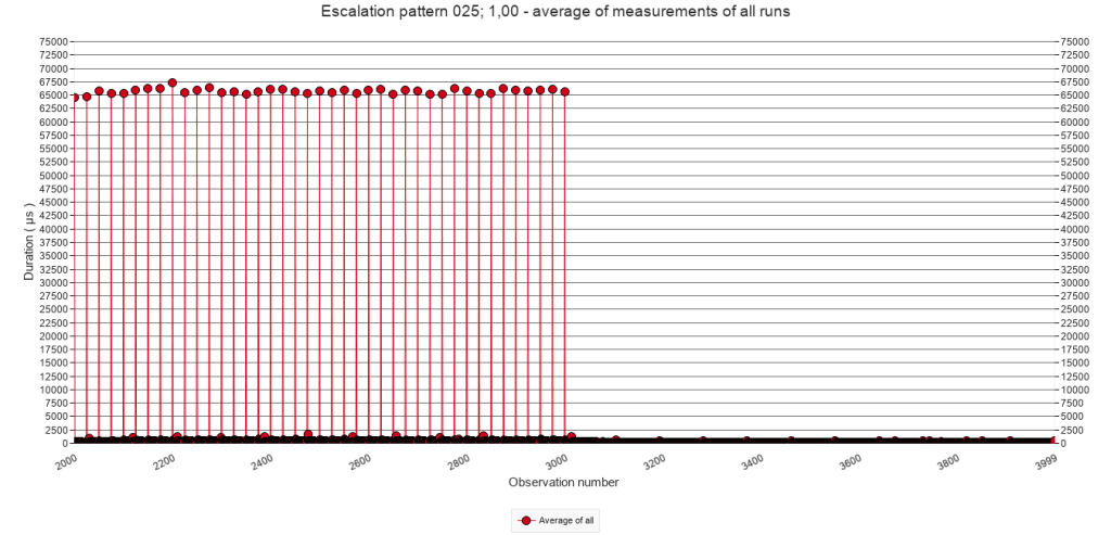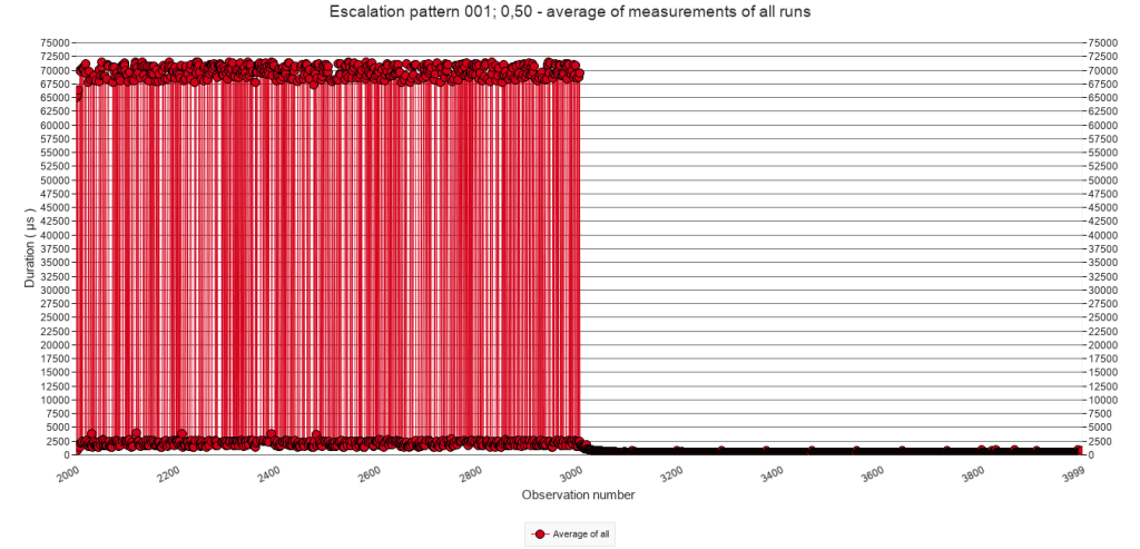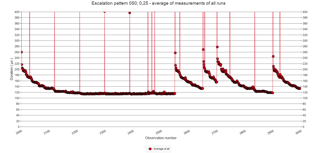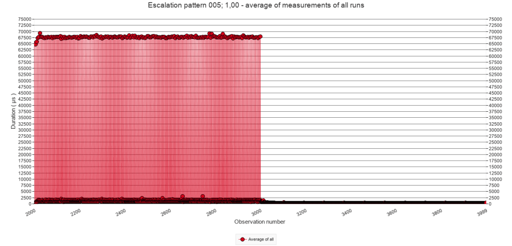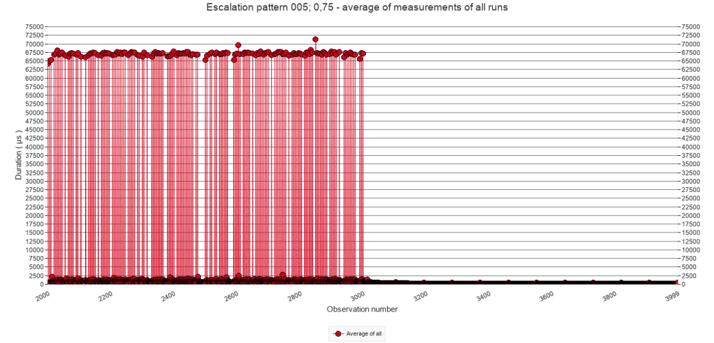 Again, it did not, but more strikingly, during the quiet period script execution time dropped to around 250 µs, rather than µs 750. This is really puzzling to me because the interruption pattern is exactly the same as in D1. Why would it drop to 250 µs instead of 750? The two tests were executed almost a month after the other tests reported here, but their test runs were alternately done during the same hours. If you have a suggestion, please do contact me, or leave a comment. If you want to explore the results, they are included in the download as test ‘Escalation pattern 001; 1,00 D2’.