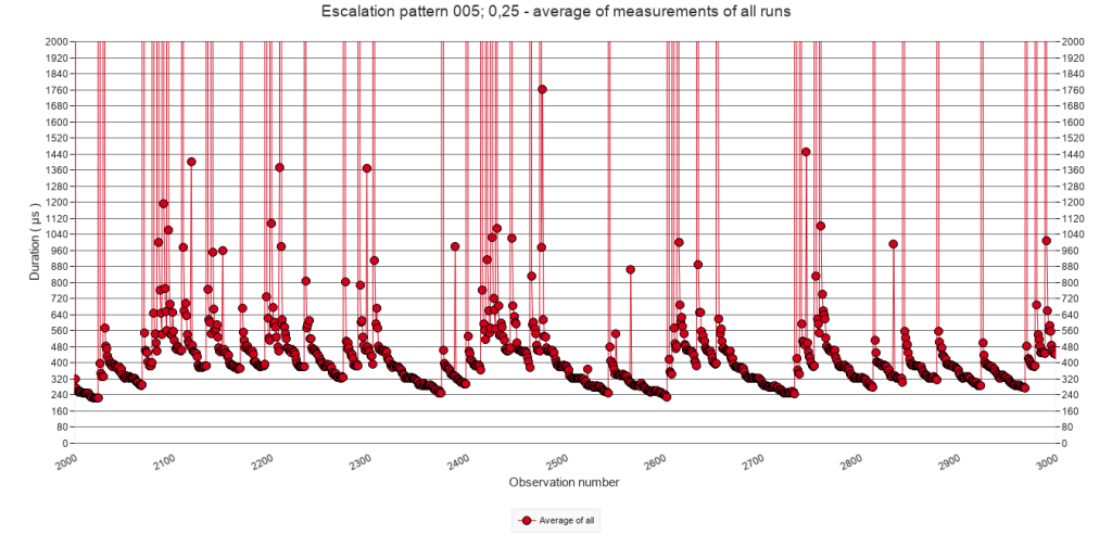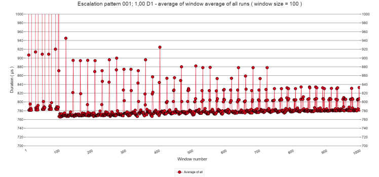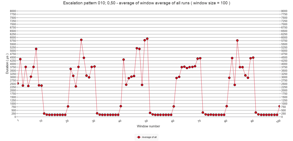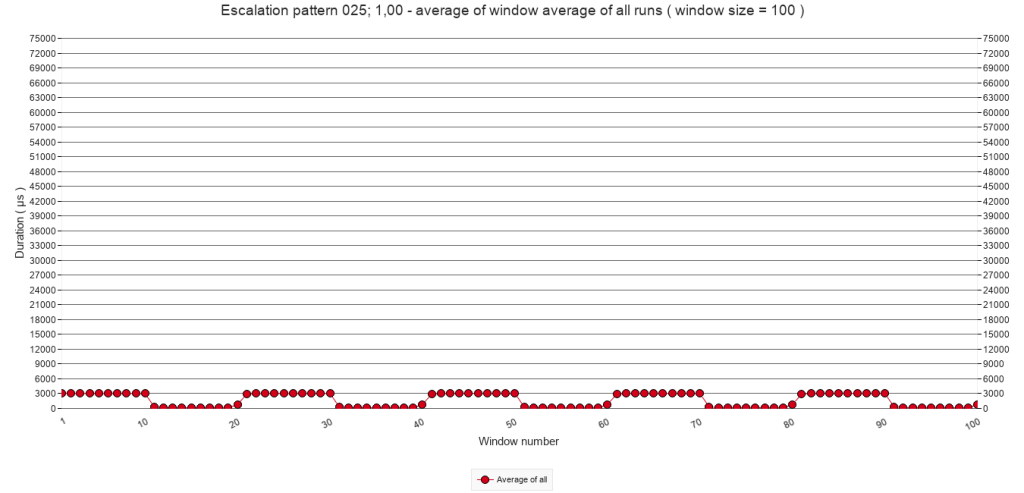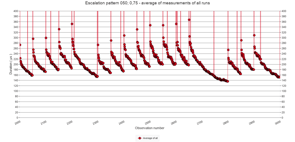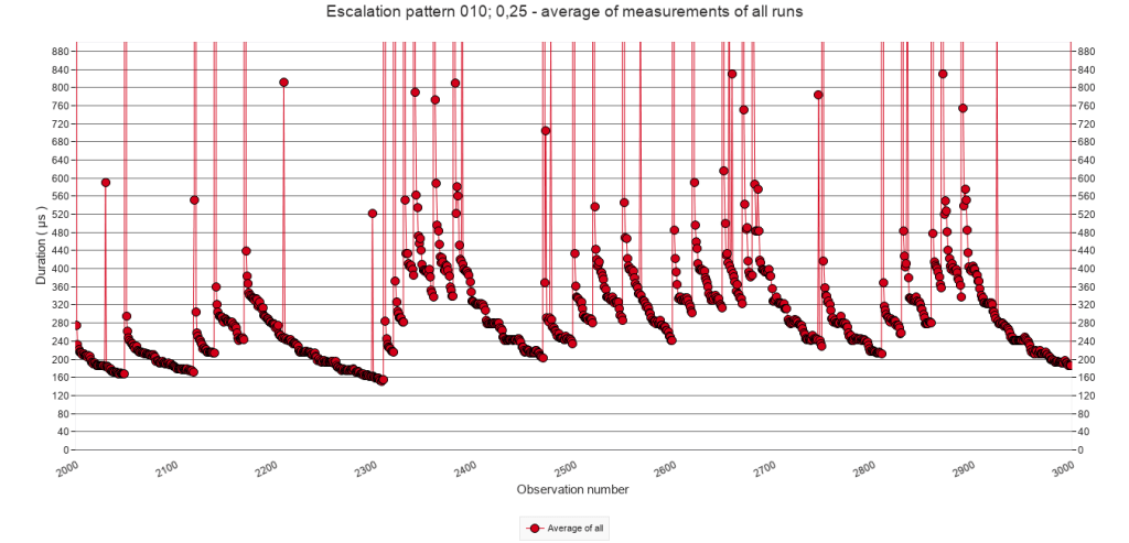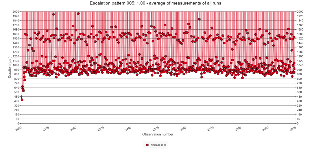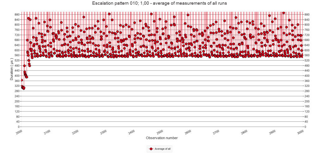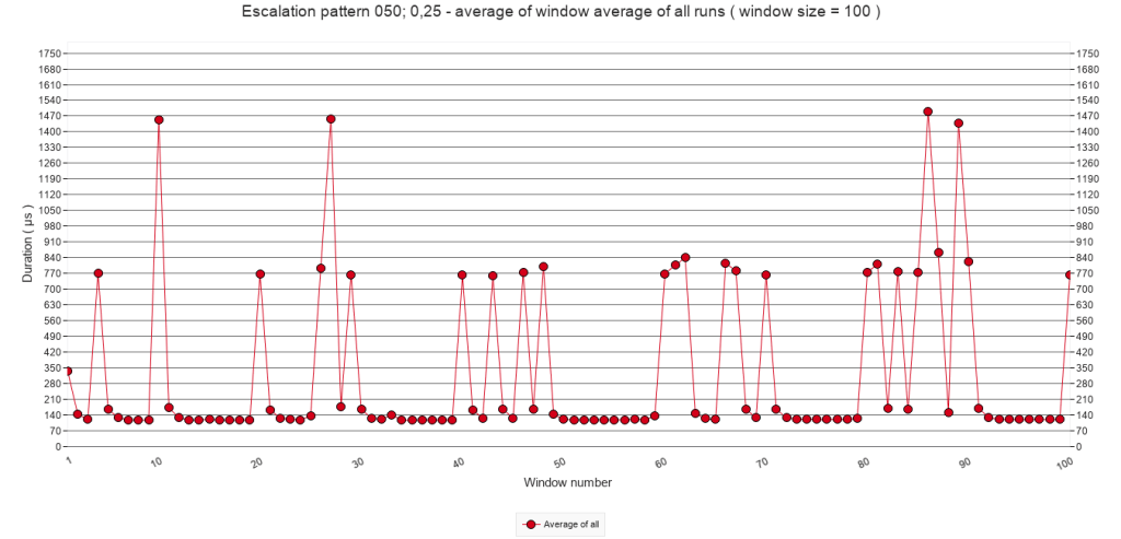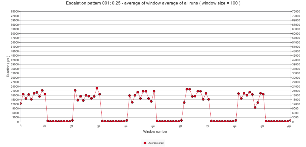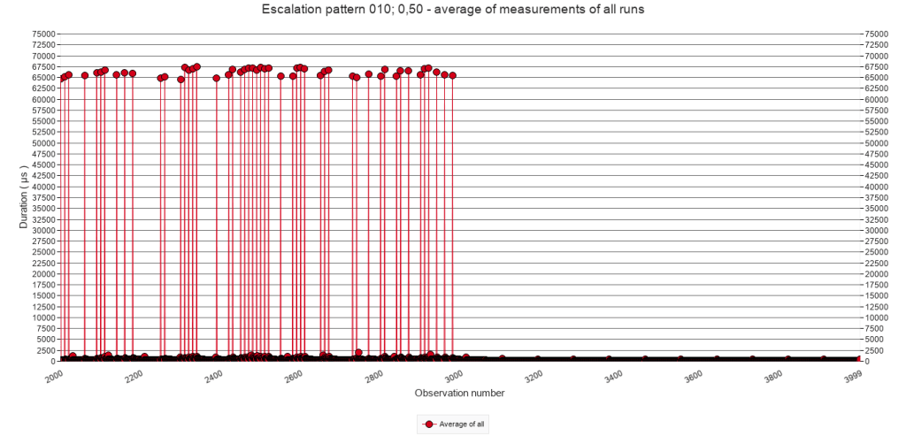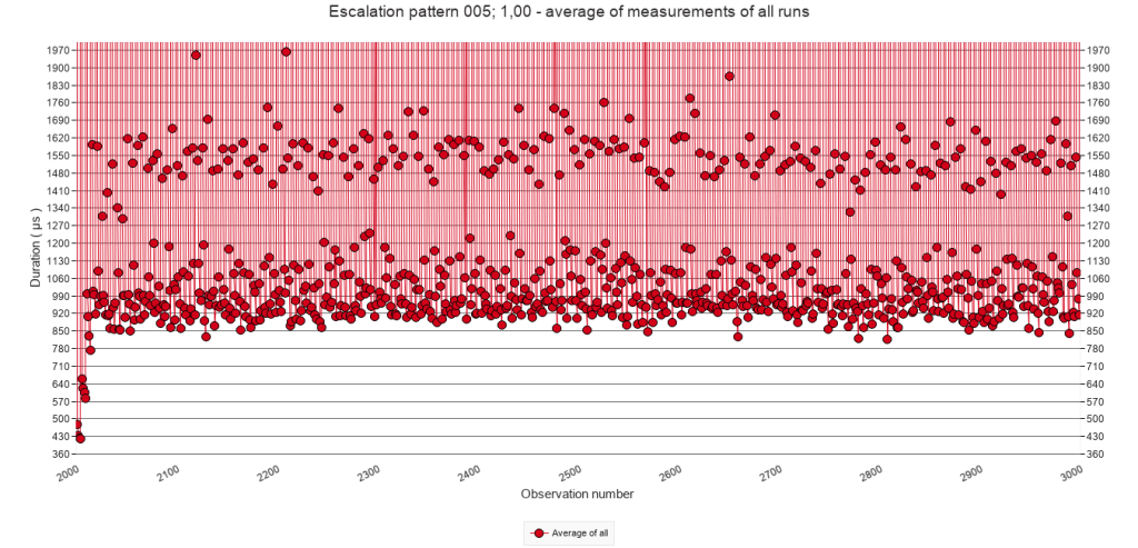Again, it did not, but more strikingly, during the quiet period script execution time dropped to around 250 µs, rather than µs 750. This is really puzzling to me because the interruption pattern is exactly the same as in D1. Why would it drop to 250 µs instead of 750? The two tests were executed almost a month after the other tests reported here, but their test runs were alternately done during the same hours. If you have a suggestion, please do contact me, or leave a comment. If you want to explore the results, they are included in the download as test ‘Escalation pattern 001; 1,00 D2’.