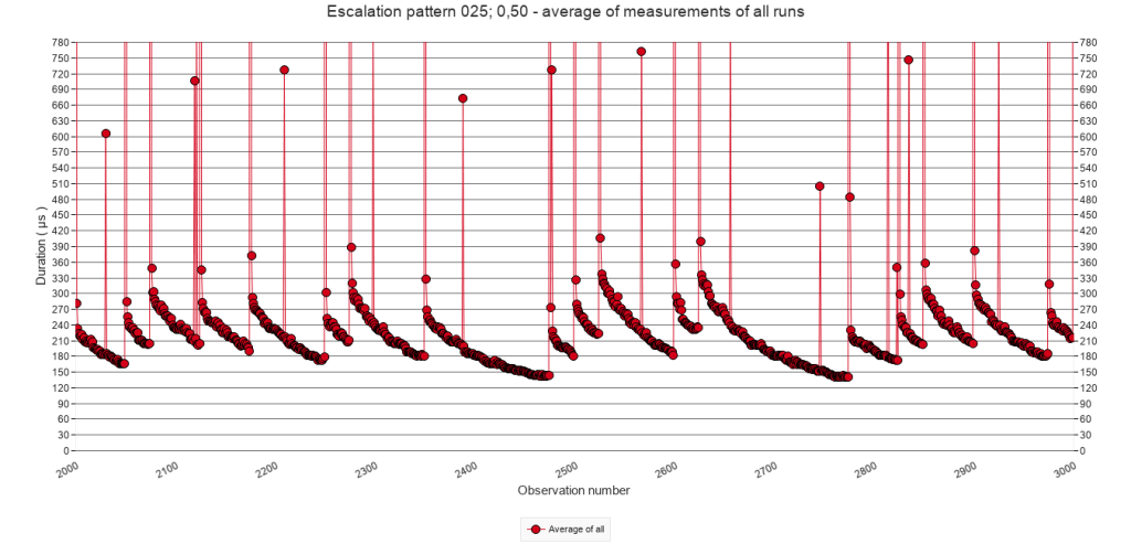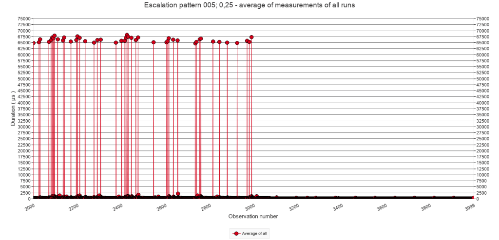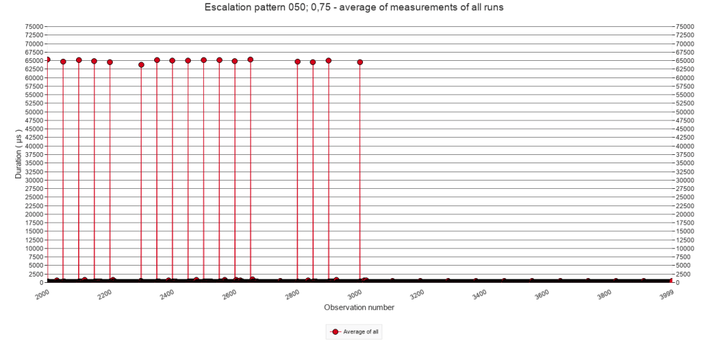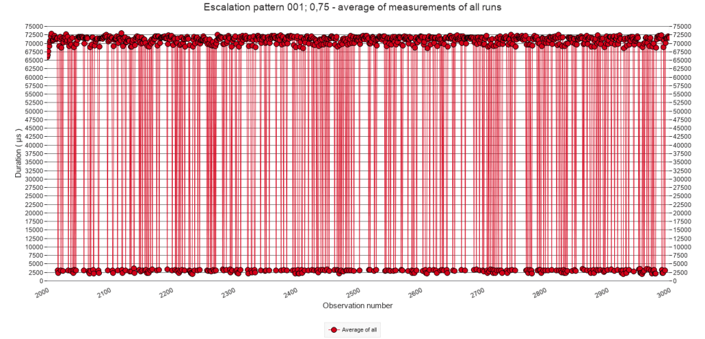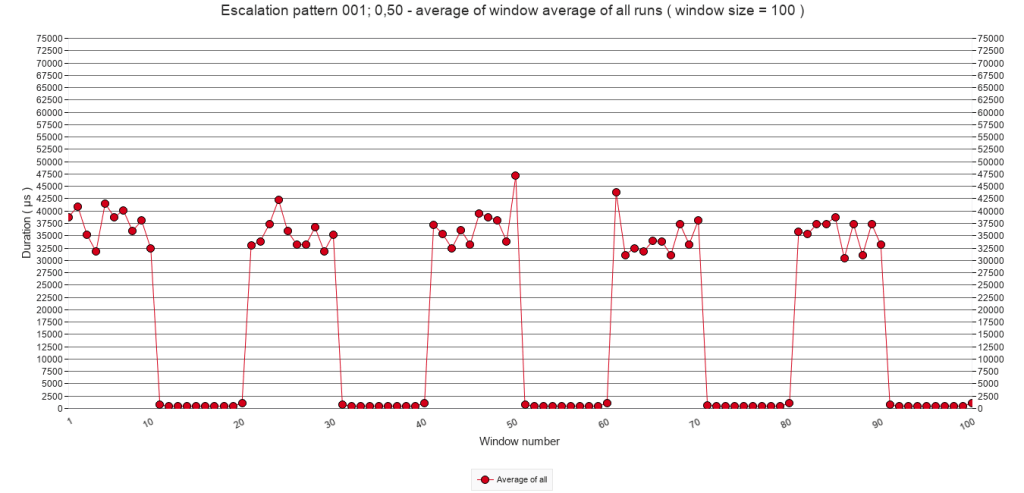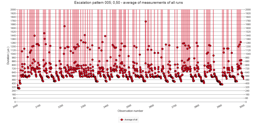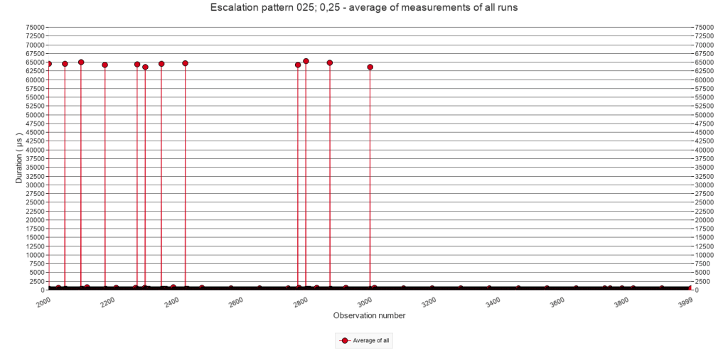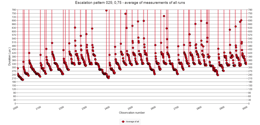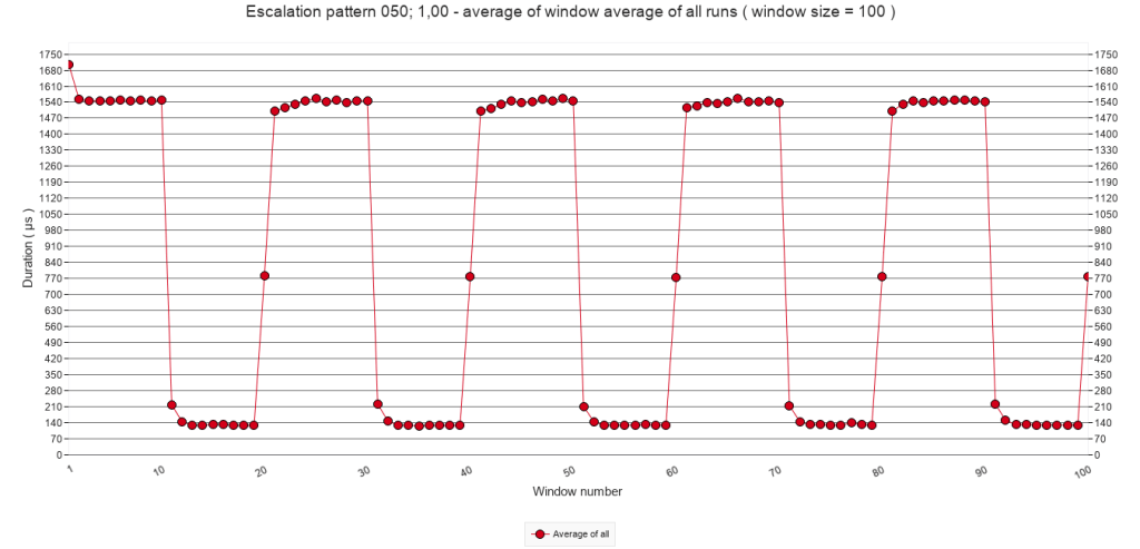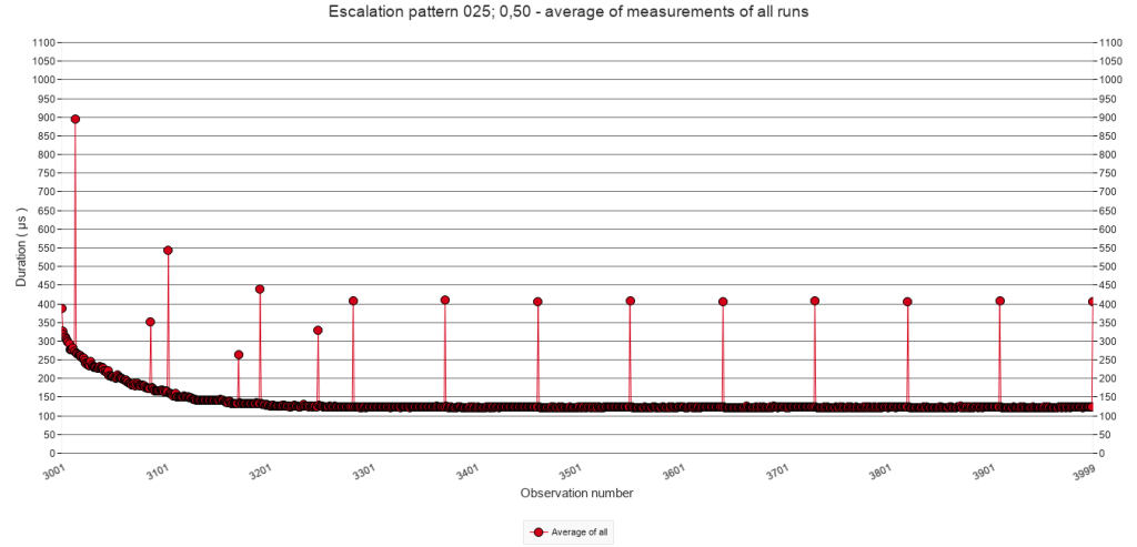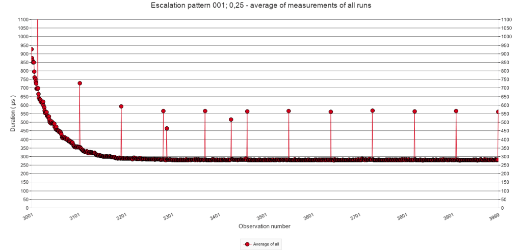 Again, it did not, but more strikingly, during the quiet period script execution time dropped to around 250 µs, rather than µs 750. This is really puzzling to me because the interruption pattern is exactly the same as in D1. Why would it drop to 250 µs instead of 750? The two tests were executed almost a month after the other tests reported here, but their test runs were alternately done during the same hours. If you have a suggestion, please do contact me, or leave a comment. If you want to explore the results, they are included in the download as test ‘Escalation pattern 001; 1,00 D2’.