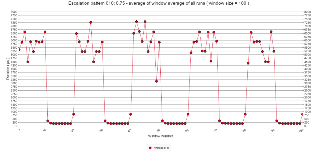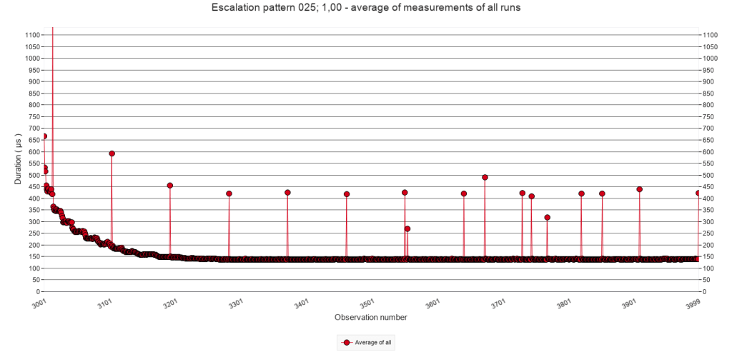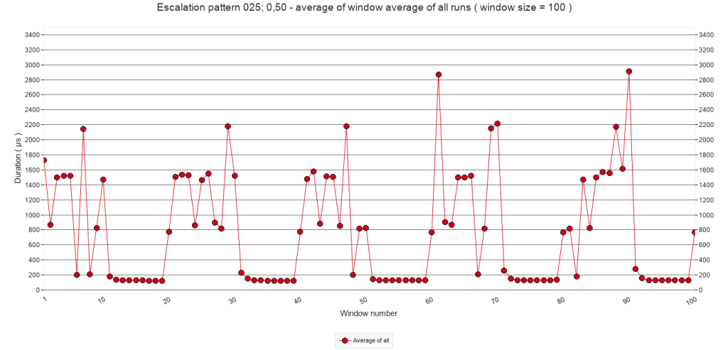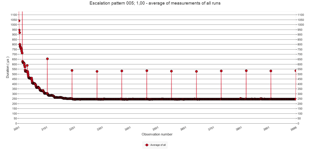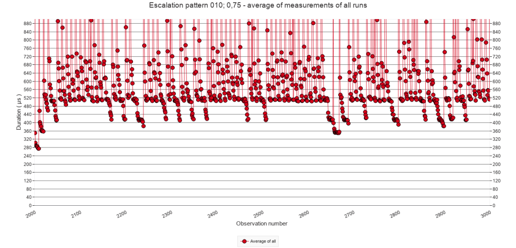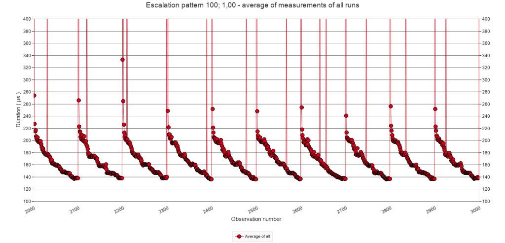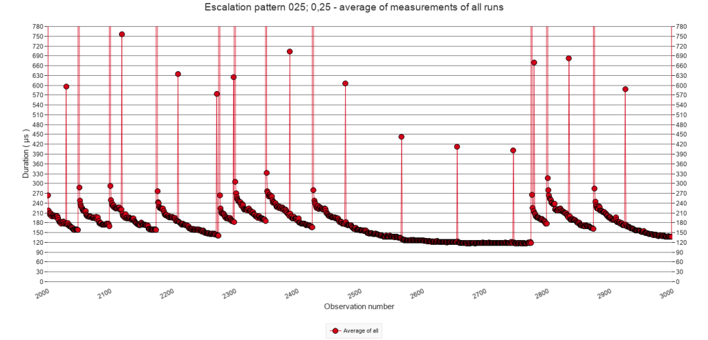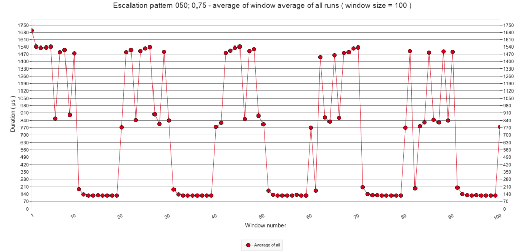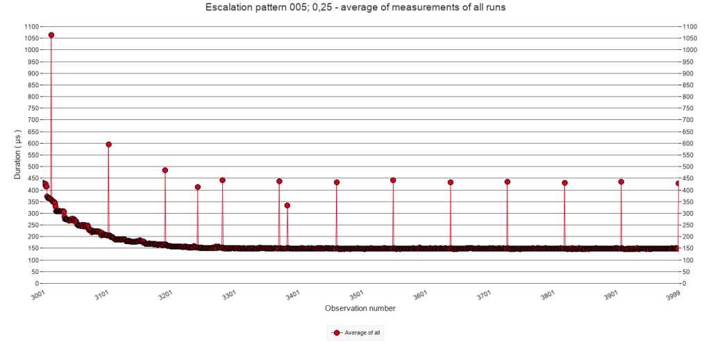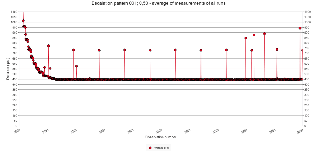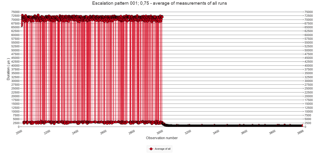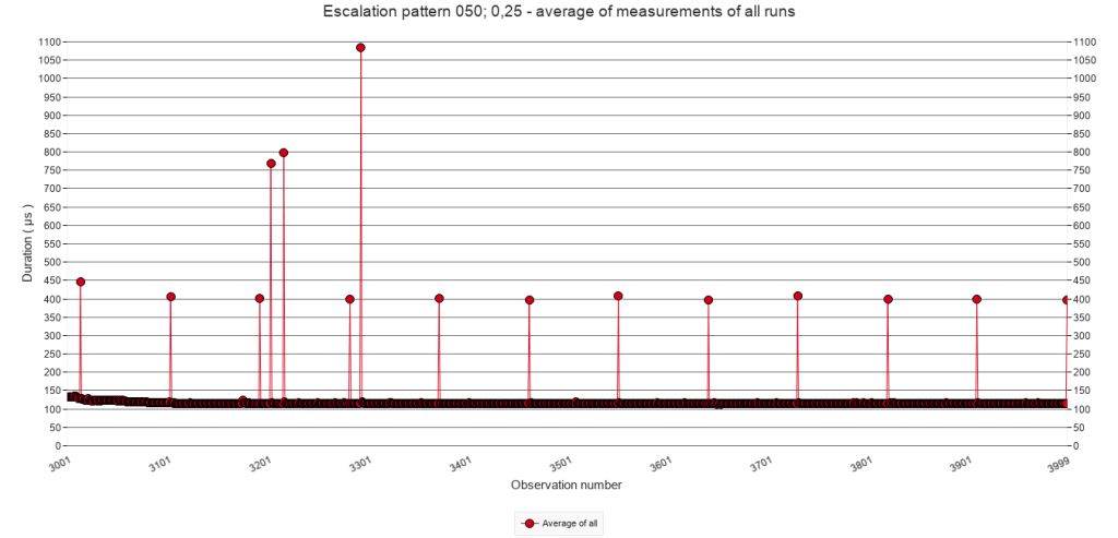 Again, it did not, but more strikingly, during the quiet period script execution time dropped to around 250 µs, rather than µs 750. This is really puzzling to me because the interruption pattern is exactly the same as in D1. Why would it drop to 250 µs instead of 750? The two tests were executed almost a month after the other tests reported here, but their test runs were alternately done during the same hours. If you have a suggestion, please do contact me, or leave a comment. If you want to explore the results, they are included in the download as test ‘Escalation pattern 001; 1,00 D2’.