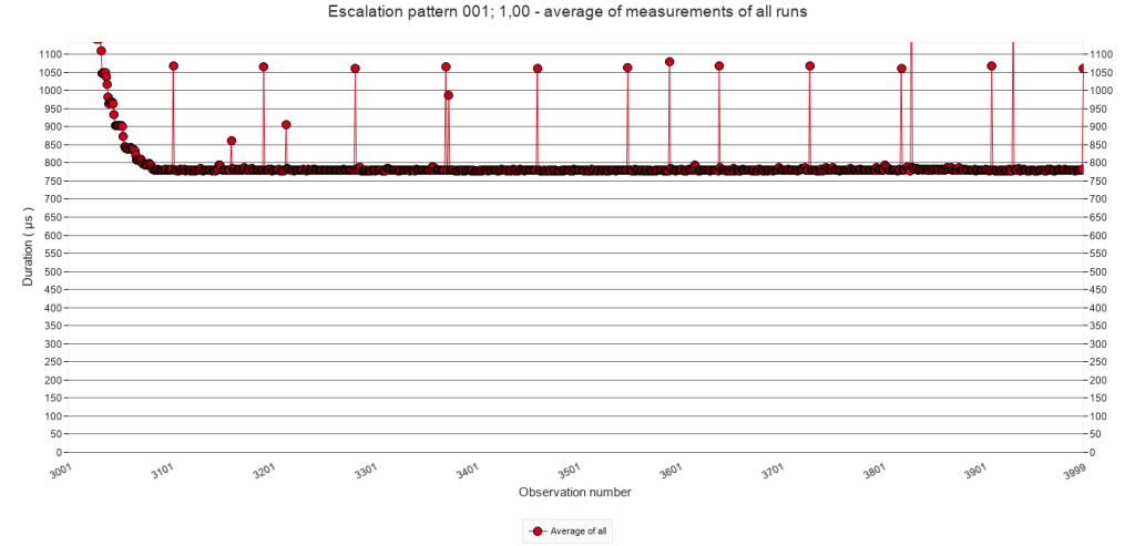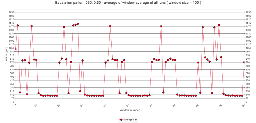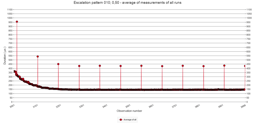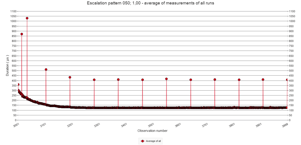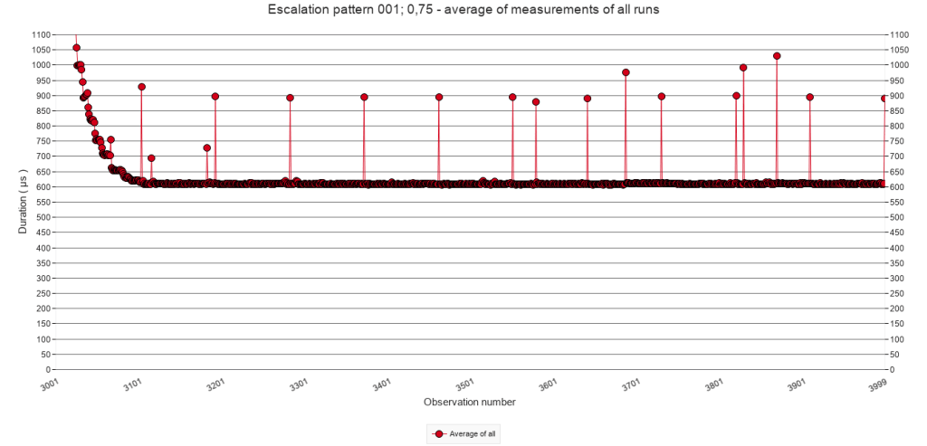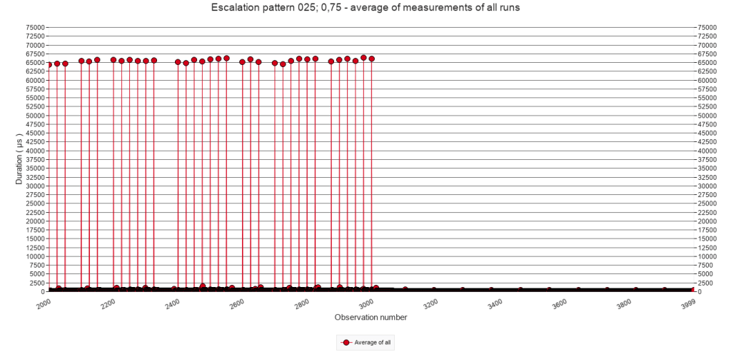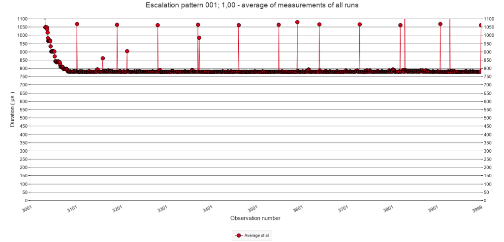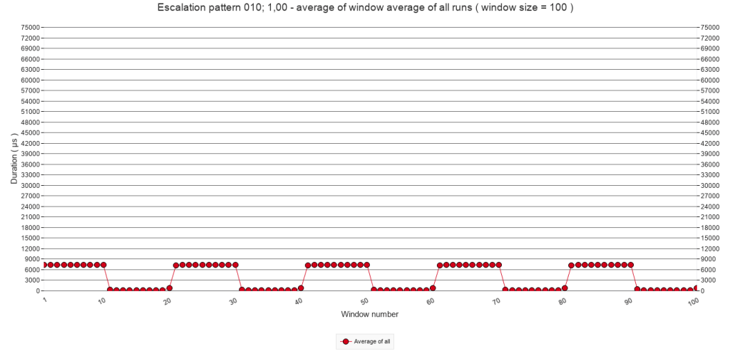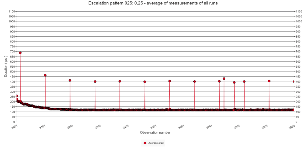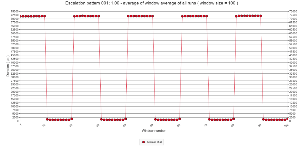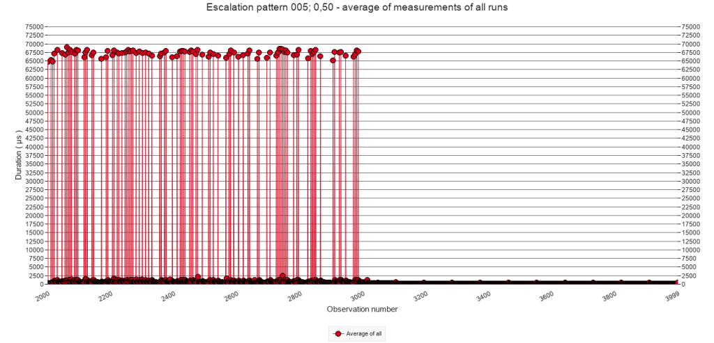 Again, it did not, but more strikingly, during the quiet period script execution time dropped to around 250 µs, rather than µs 750. This is really puzzling to me because the interruption pattern is exactly the same as in D1. Why would it drop to 250 µs instead of 750? The two tests were executed almost a month after the other tests reported here, but their test runs were alternately done during the same hours. If you have a suggestion, please do contact me, or leave a comment. If you want to explore the results, they are included in the download as test ‘Escalation pattern 001; 1,00 D2’.