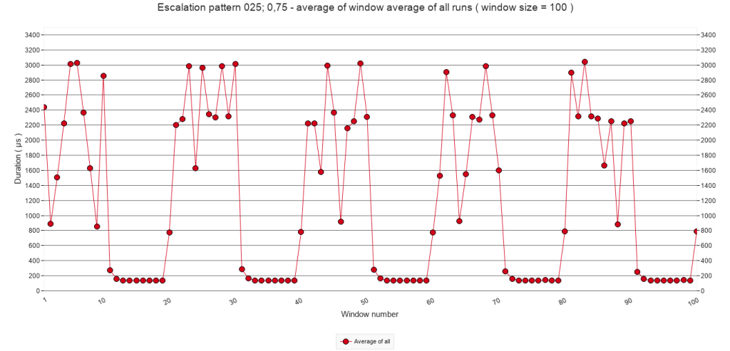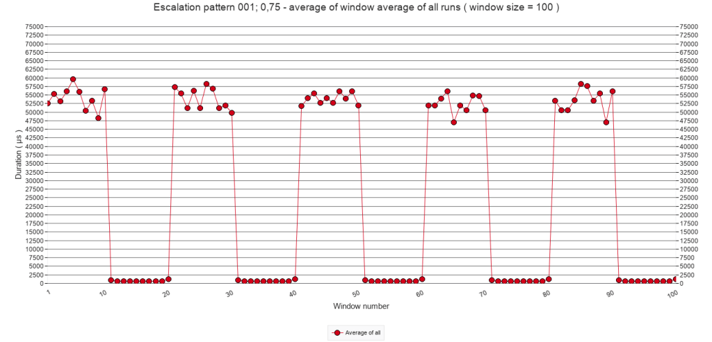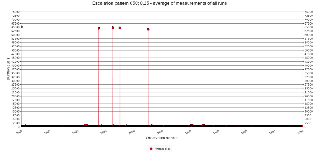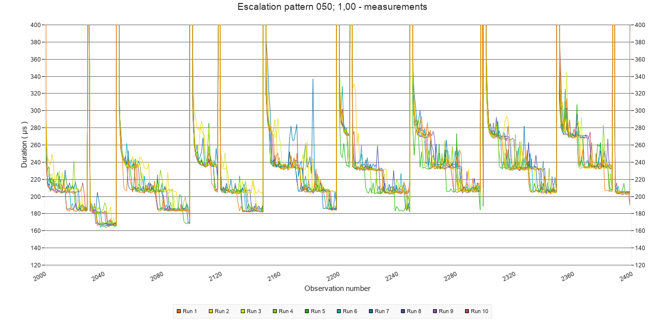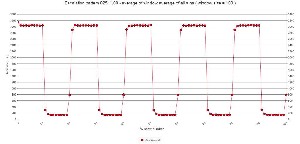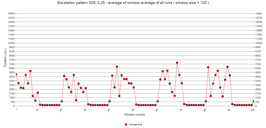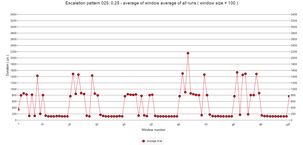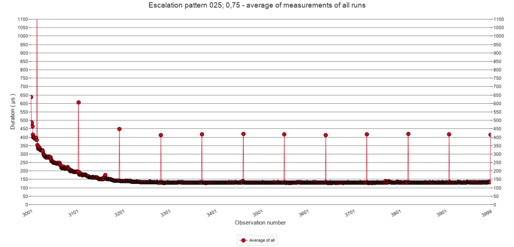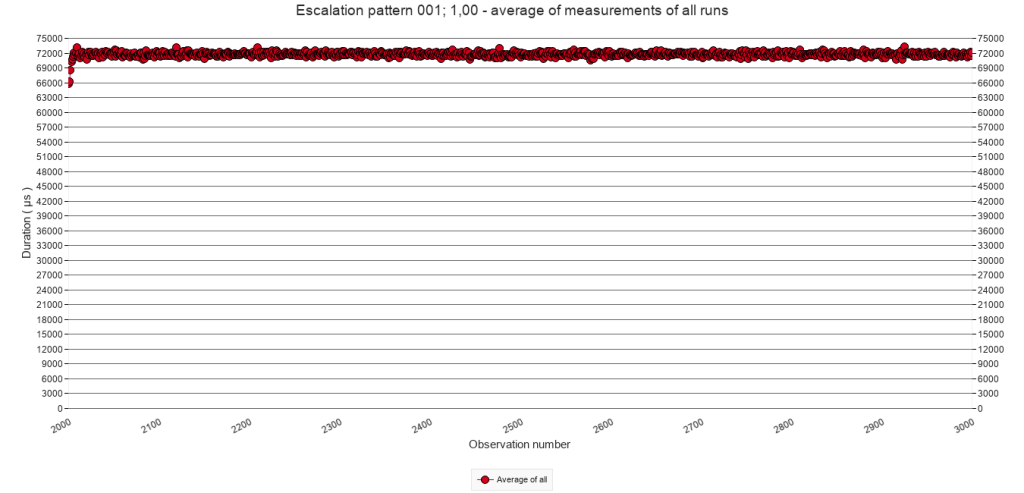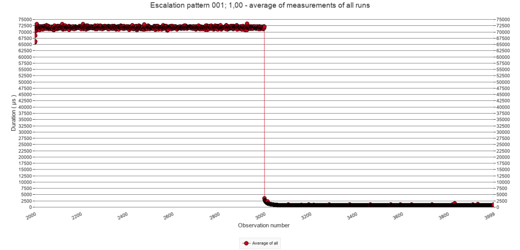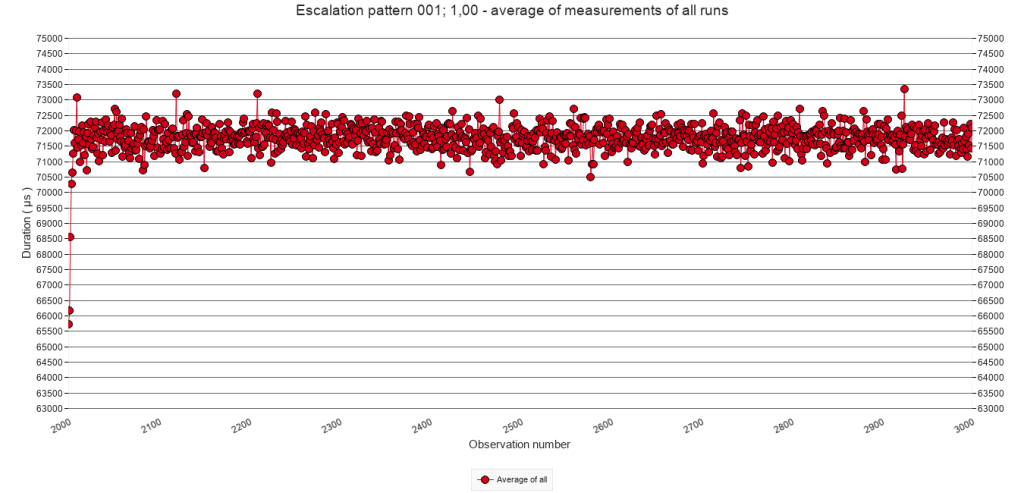 Again, it did not, but more strikingly, during the quiet period script execution time dropped to around 250 µs, rather than µs 750. This is really puzzling to me because the interruption pattern is exactly the same as in D1. Why would it drop to 250 µs instead of 750? The two tests were executed almost a month after the other tests reported here, but their test runs were alternately done during the same hours. If you have a suggestion, please do contact me, or leave a comment. If you want to explore the results, they are included in the download as test ‘Escalation pattern 001; 1,00 D2’.