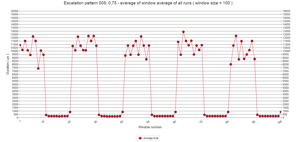 As with the experiments described in earlier posts, each test had 10 test runs. Each test run executed 10.000 calls. At the start of a test run, the Pause steps were inserted ( according to the frequency set for the test ) for a duration of 1000 calls in total. For the purposes of this post, this will be referred to as the ‘interruption period‘. Then followed 1000 calls without Pause steps, to allow the script execution time to return to a base line. This will be called the ‘quiet period‘. After the quiet period followed another interruption period. And so on until after 10.000 calls, 5 interruption and quiet periods were realized.
