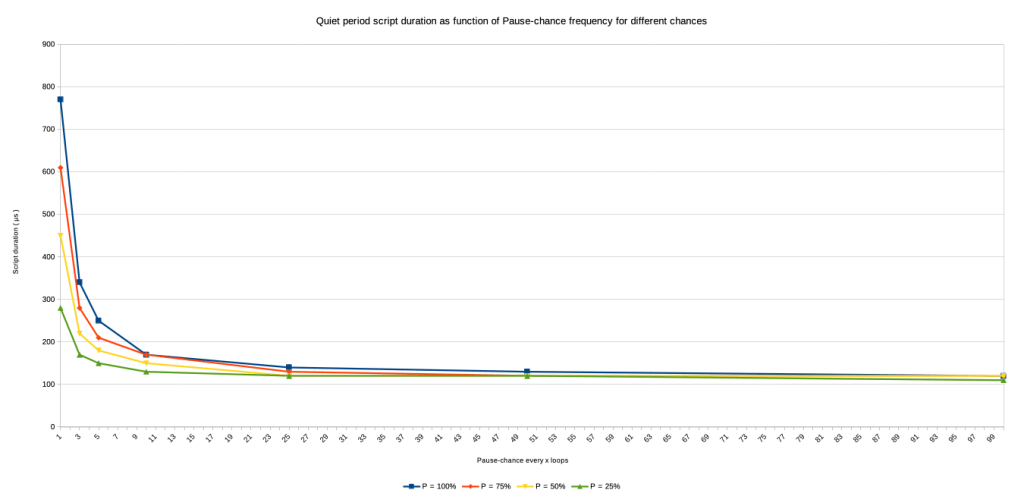 Also notice that with high pause-chance frequencies minimum script duration times are multiple times and almost one order of magnitude higher than the baseline time of 111 µs, which is a significant escalation.
