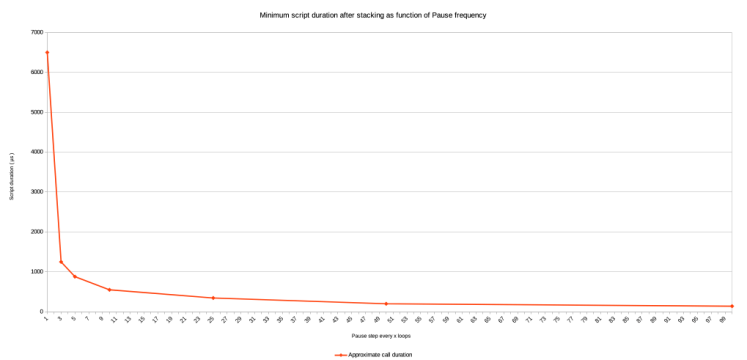 Which levels of stacking are reached, also depend on both the pause-chance frequency and the chance. The higher they are, the higher levels are reached, that is the higher they are the slower calls without Pause step are executed. ( See sections 2.2.C and 2.3.C ) For example, if the pause-chance frequency is every 25 calls and the chance is 100%, then the minimum execution time for a script call without pause step is around 340 µs. If the pause-chance frequency is every 5 calls and the chance is 100% then it is around 900 µs.