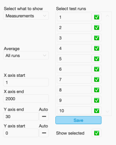 These two settings determine which measurements from each test run are shown. They can be set manually and should range between 1 and the maximum value count, which can be found in the ‘Test runs’ tab.