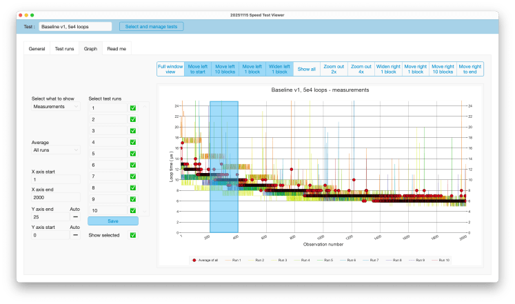 Selecting test runs influences the graph in multiple ways. The foremost one is which test runs will be shown. However, depending on the ‘Average’ setting discussed above, it may also influence which average is depicted.
